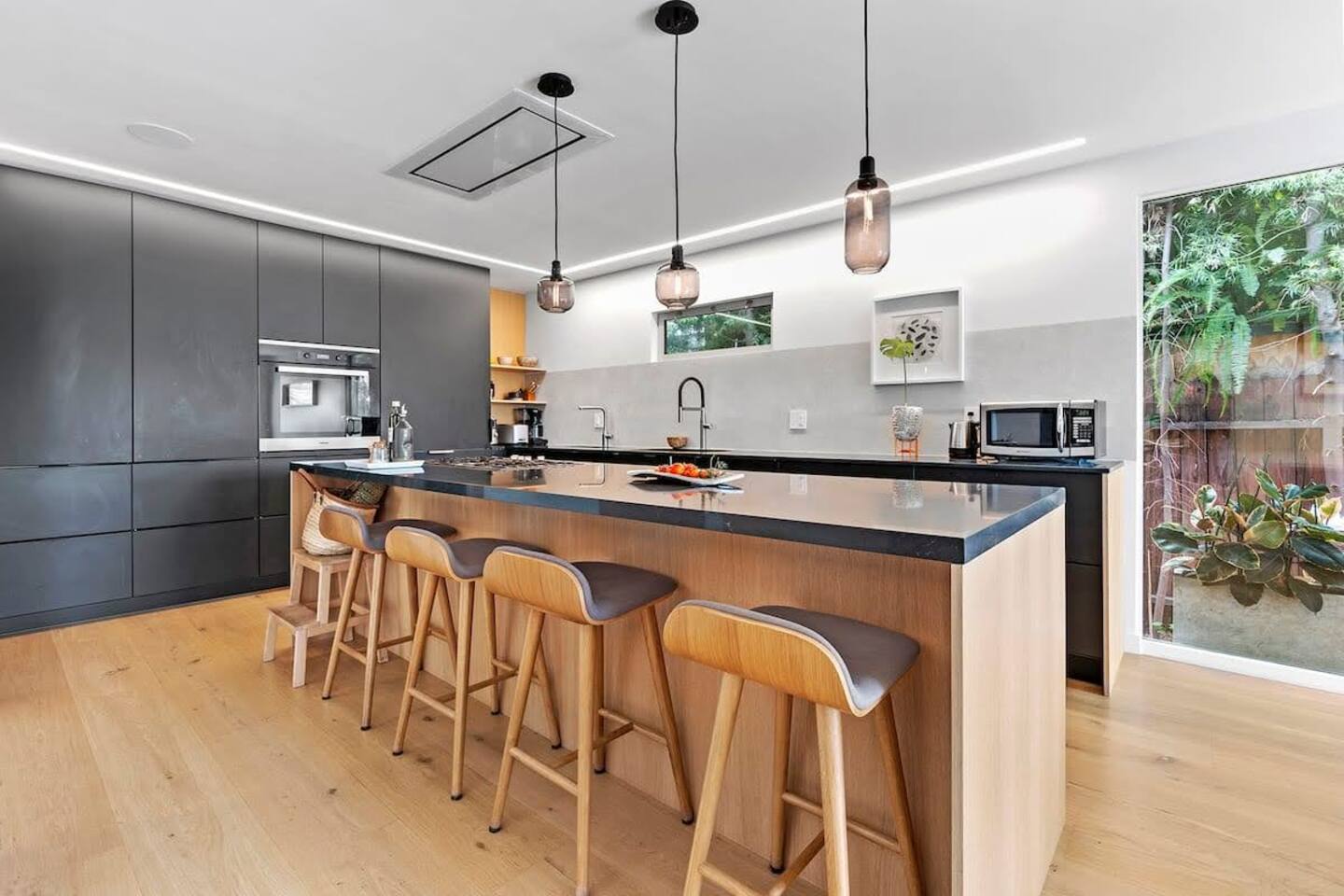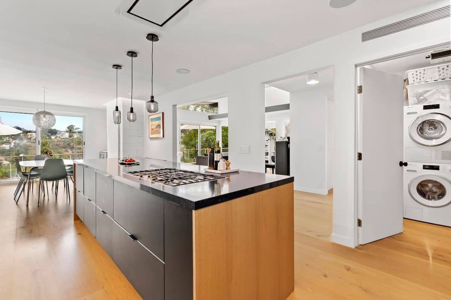 Step into a world where sleek, contemporary aesthetics meet natural light and greenery. Our home offers an airy, open-plan living and dining area, perfect for family gatherings or a cozy night in. The floor-to-ceiling windows frame stunning hillside vistas, allowing you to dine against the backdrop of a setting sun. The gourmet kitchen is a foodie’s dream, featuring state-of-the-art appliances, chic cabinetry, and a breakfast bar for casual meals. Each bedroom is a serene escape with plush bedding and minimalist touches, ensuring restful slumber after a day of exploration. Outdoors, the private pool beckons you for a refreshing dip, surrounded by a manicured garden that blooms with local flora. The expansive deck and landscaped backyard invite you to lounge or dine al fresco while the children enjoy the trampoline’s playful bounce. Amenities: - High-Speed Wi-Fi for Leisure & Work - Smart TVs with Streaming Services - Central Heating & Air Conditioning - In-Home Washer & Dryer Please note that the garage is not available for guest use. You can park right in front of the house. As a courtesy to our neighbors please avoid parking directly in front of their doorways and other pathways.
