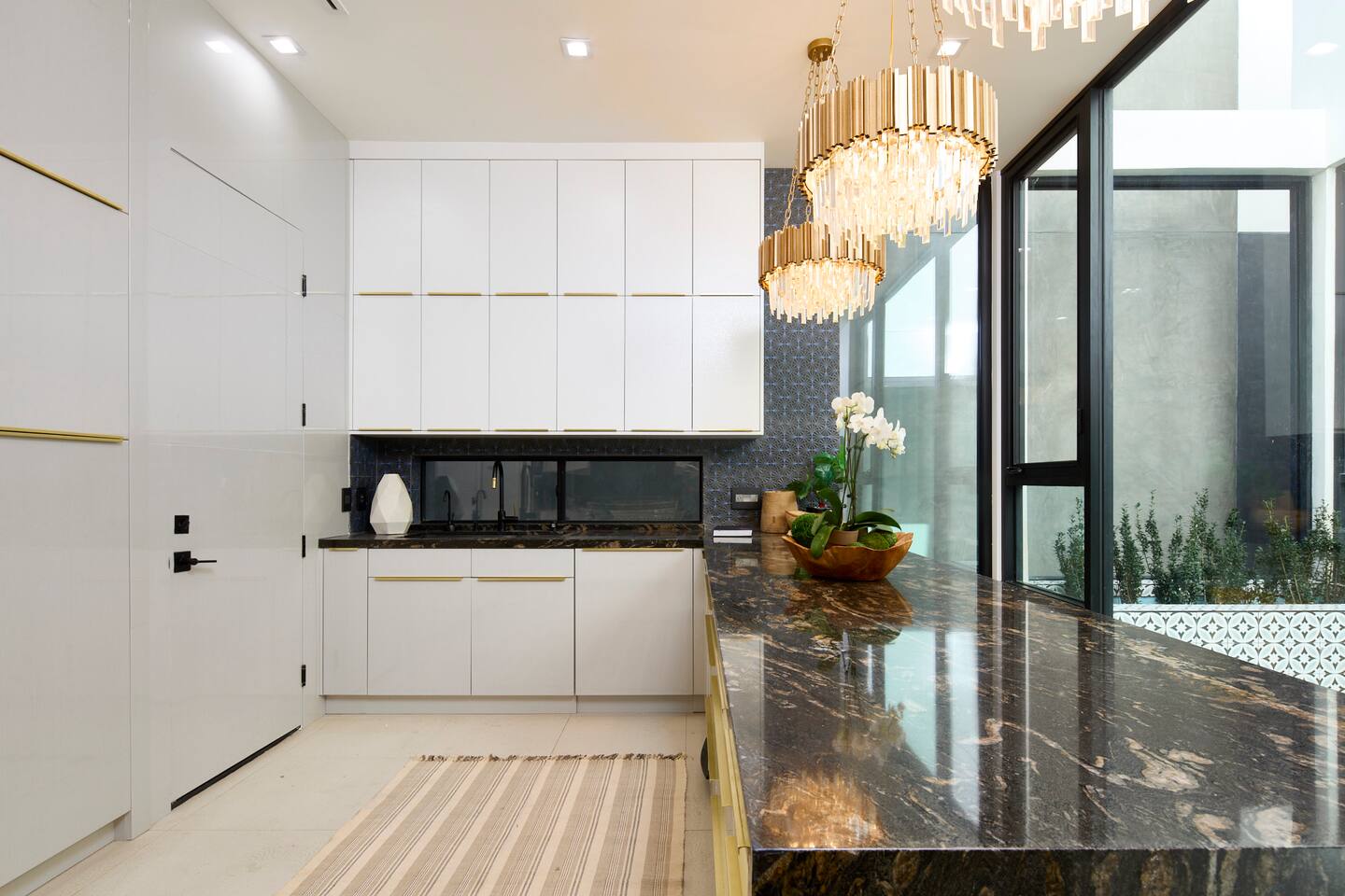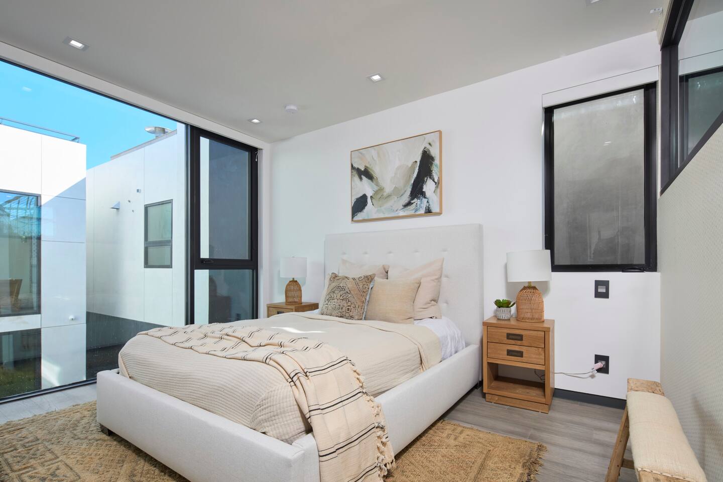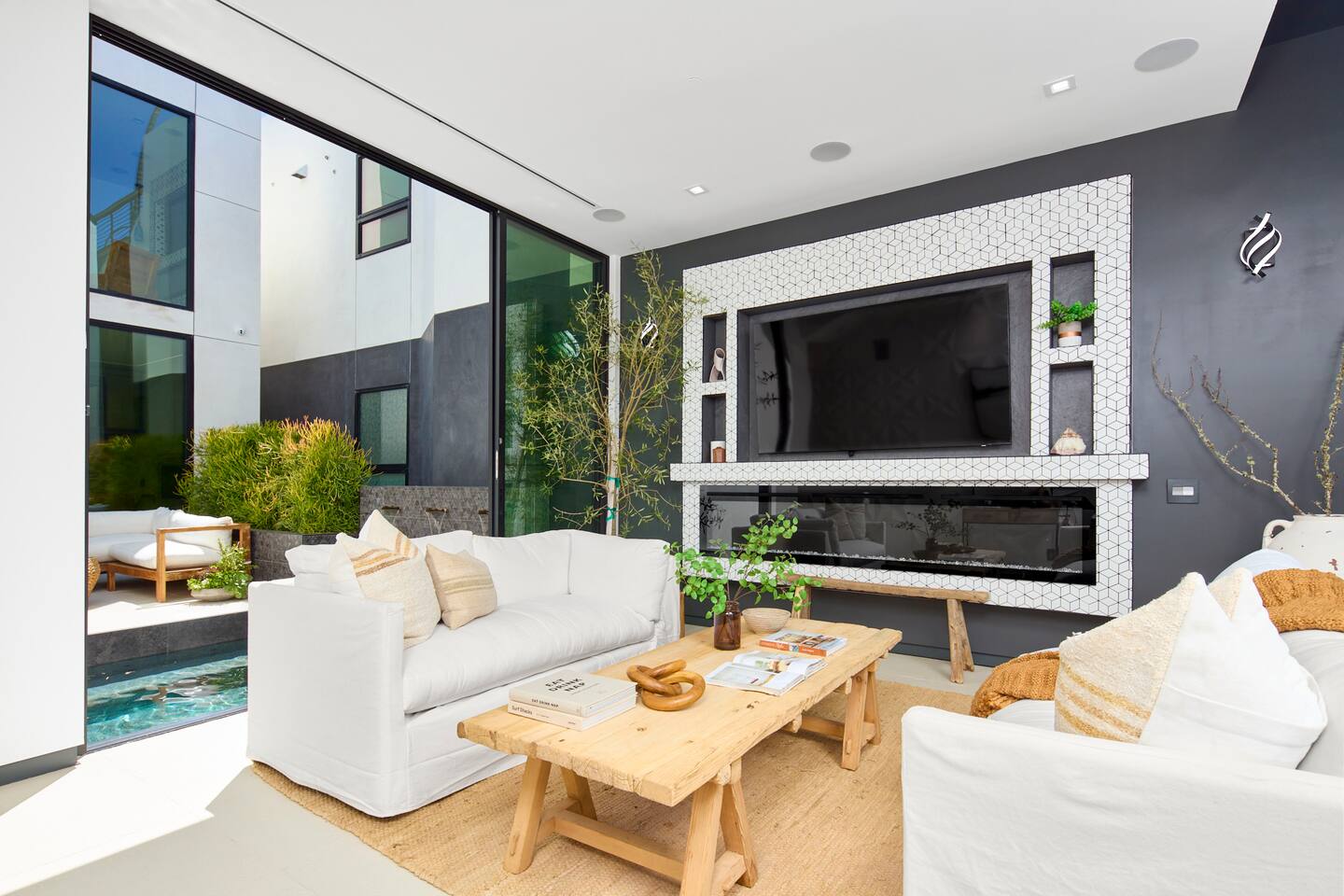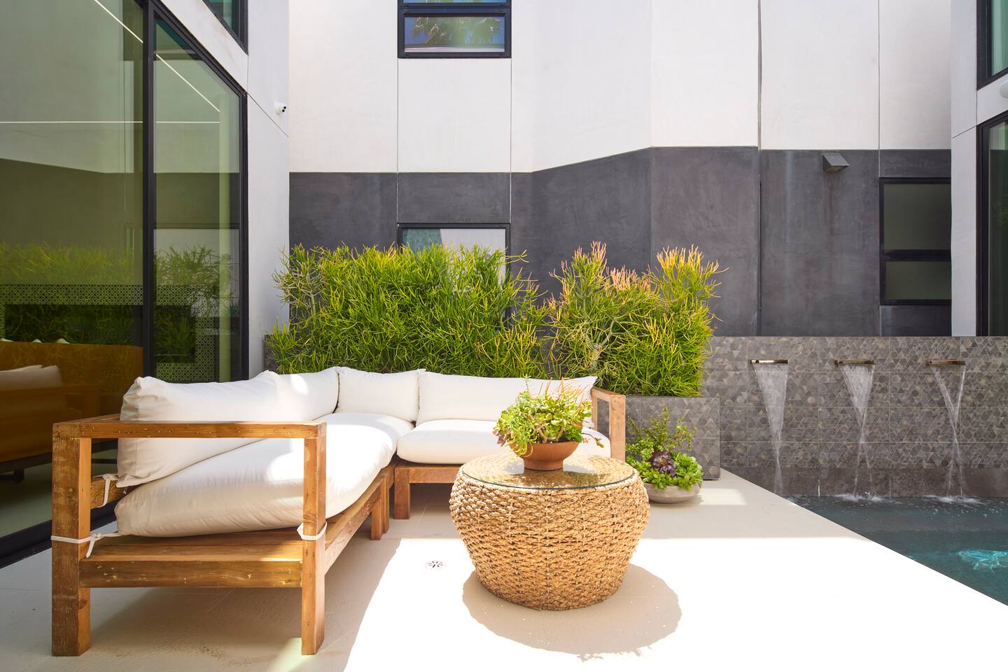 ABSOLUTELY NO PARTIES This impeccably designed 'Glass Lady' offers a luxurious, sunlit live/work oasis just steps from Abbot Kinney and Lincoln Blvd. Its striking design contrasts light-filled spaces with dark accents and eclectic patterns for a unique, modern vibe. The heart of the home is a stunning atrium with indoor-outdoor living and a plunge pool. Enjoy grand ceilings, artistic details, and a chef's kitchen with top-of-the-line appliances. *When you book this property you agree to the following House Rules and guest requirements.* For guest stays of approximately a week or more, Guests understand that someone will come to water the indoor plants during regular business hours. Guests also understand that the pool, maintenance, and/or landscape team will also have exterior access for their regular maintenance work during their stays. PRIOR TO ARRIVAL - Provide a list of all guests staying at the property. - This needs to be done 24 hours before check-in and before access codes are shared. CHECK-IN/OUT & EARLY ARRIVALS - Standard Check-in: 4:00 pm. - Early Check-in: As early as 6:00 a.m. for half the fee of the next night; must be requested as soon as possible but no later than 72 hours before arrival. Depending on bookings, Early Check-in may not be available. - Check-out: 10:00 am; No storage or later pickups are allowed for belongings. ACCESS & LOCKS - Various entry codes are provided at check-in. PARKING - 2 parking garage space available as well as additional one spot parallel parked in front of the garage JACUZZI - Optional heating is available with associated fees. - The fee to heat the Jacuzzi is $100/day (Guests must pay the fee for the entire time not just selected nights as it is programmed in advance and would not change during the stay). For this price, the jacuzzi will be heated to 104 degrees (time to heat est. at 2 hrs). - Notify us 24 hours prior to heating arrangements; less notice might not guarantee service. KITCHEN & APPLIANCES - Cold/hot water is available from the sink dispenser. - Instructions for the Miele coffee maker will be provided. - Monogram microwave, Thor oven, and stovetop ADDITIONAL AMENITIES - Laundry facilities available with specific instructions for use. - Thermostats and heating systems throughout with specific operation instructions. - Electric fireplaces, gas fireplaces, and firepits SAFETY & REGULATIONS - Notify if children (age 6 or younger) or non-swimmers will be present in advance for pool and alarm safety setups at least three days in advance. Host must also confirm. - Trash disposal instructions provided; specific bins for trash and recycling are located in front of the house (You will see a door to open) - No parties or unauthorized events unless pre-approved by the host/owner. Event rates different. - Adhere to the approved number of guests; additional ones need prior approval and may incur charges. - Quiet hours: 10 pm - 8 am. - No commercial filming or photography without permission and extra fee. - Prohibited items: fireworks, flammable substances, illegal substances. - BBQ and firepit instructions provided for safe use. - No smoking inside. This includes the use of tobacco, cannabis, e-cigarettes, etc. - Fire Extinguisher - Under kitchen sink - Under BBQ on rooftop - In the event of a fire, immediately call 9-1-1 - Clear the area of all people and use the fire extinguishers to extinguish the fire yourself. If unable to extinguish, leave immediately to a safe location outside of the property. - Emergency: In the event of an emergency please call 9-1-1.